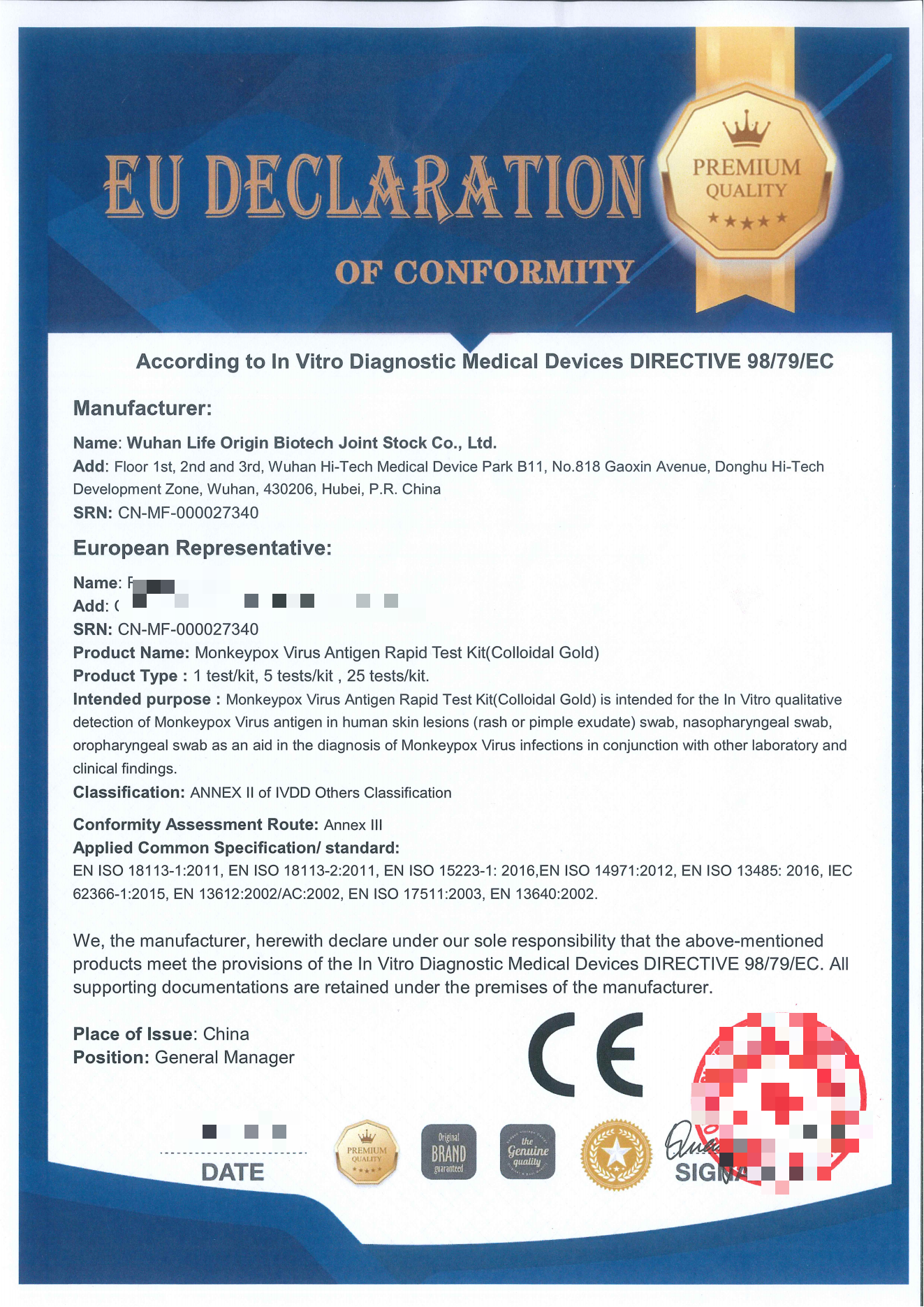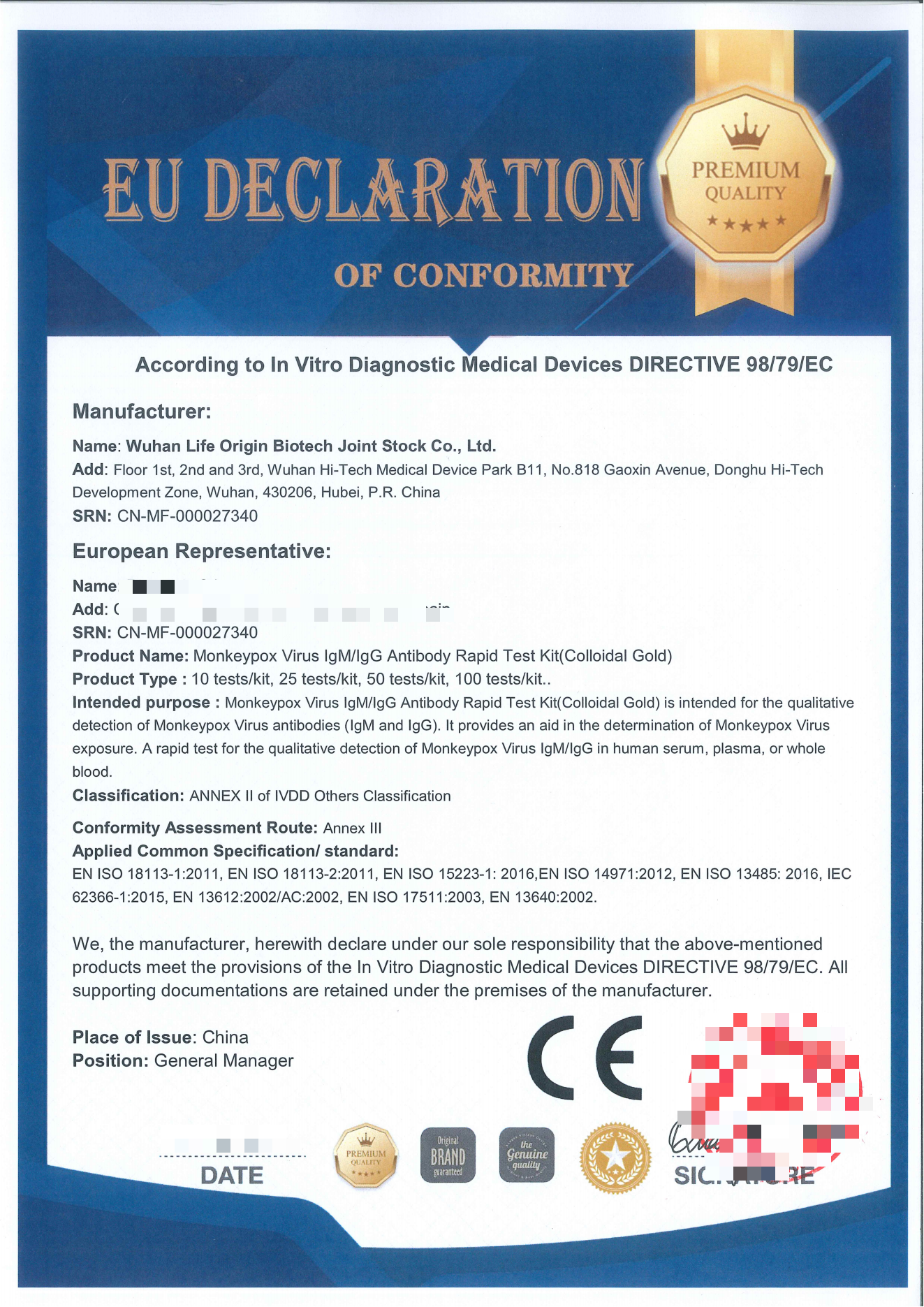面對(duì)全球突然爆發(fā)的猴痘疫情,武漢生之源生物科技股份有限公司(下稱“生之源生物”)自主研發(fā)的產(chǎn)品猴痘病毒(MPXV)抗原檢測(cè)試劑盒(膠體金法)、猴痘病毒(MPXV)IgM/IgG 抗體檢測(cè)試劑盒(膠體金法)兩款產(chǎn)品近日獲得歐盟CE認(rèn)證。這是繼猴痘病毒核酸檢測(cè)試劑盒(熒光PCR法)斬獲歐盟CE認(rèn)證之后的兩款猴痘病毒檢測(cè)試劑盒。這三款試劑盒均可在歐盟地區(qū)以及認(rèn)可歐盟CE認(rèn)證的國(guó)家或地區(qū)進(jìn)行銷售,為猴痘病毒感染的防控及診治提供檢測(cè)依據(jù)。