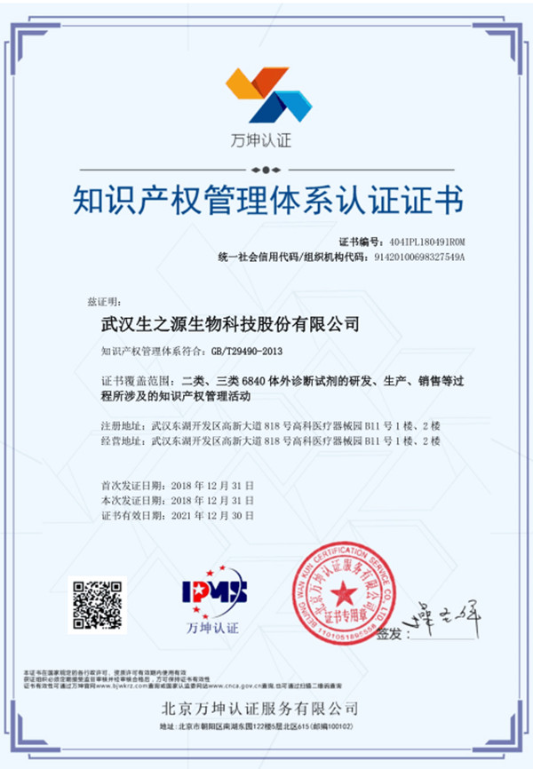 作為國內(nèi)體外診斷試劑的后起之秀,武漢生之源一貫重視知識產(chǎn)權工作,公司專門成立知識產(chǎn)權工作小組,2017年8月起全面開展《企業(yè)知識產(chǎn)權管理規(guī)范》相關認證工作,并在順利完成為期半年的試運行工作后啟動認證申請流程。今年11月,北京萬坤認證服務有限公司組織專家團隊對生之源進行了知識產(chǎn)權管理體系認證的現(xiàn)場審核。經(jīng)過嚴謹、全面的審核,武漢生之源符合該標準的相關要求,順利通過認證。