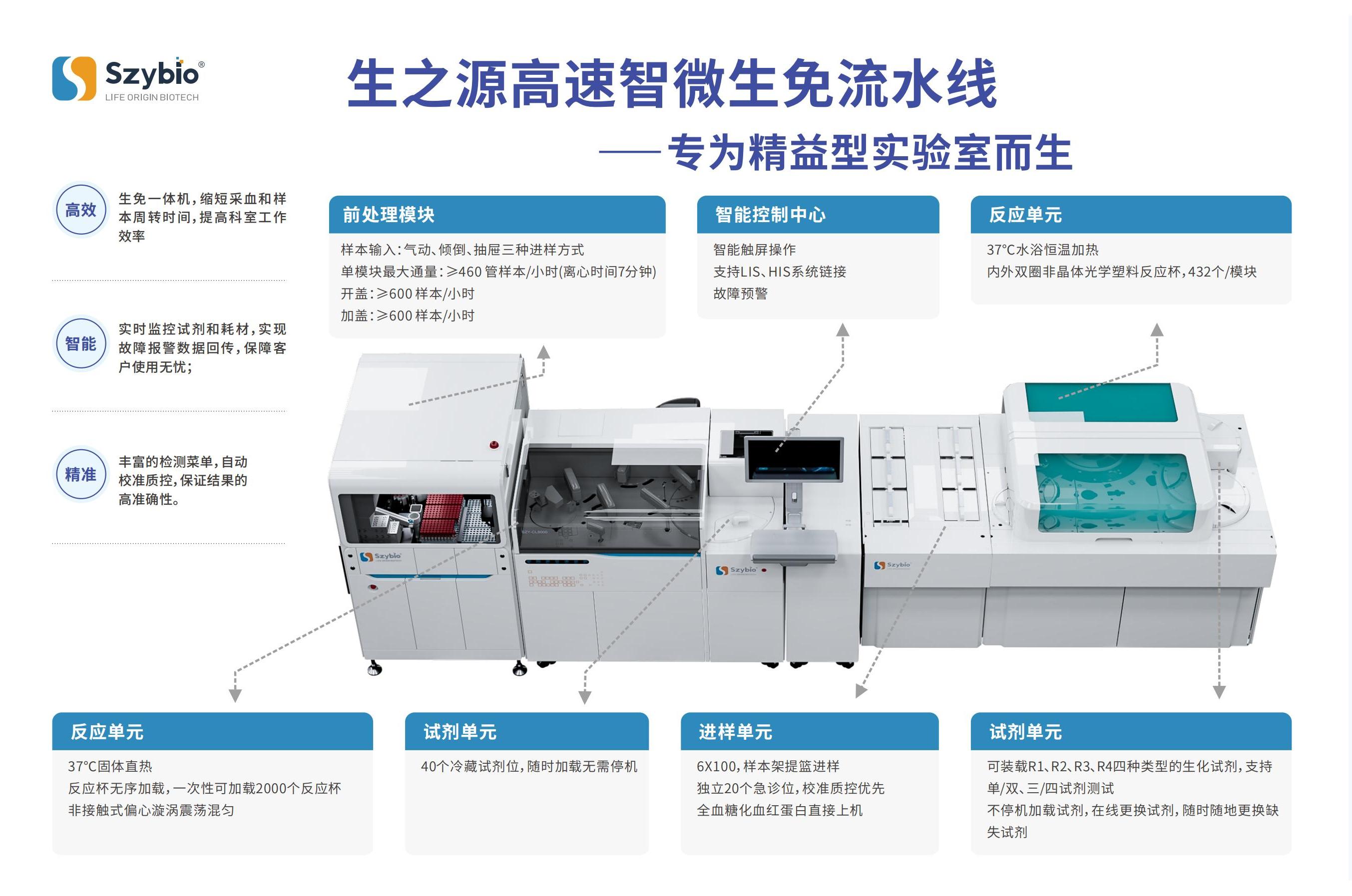 生之源高速極簡(jiǎn)生免流水線配備20個(gè)獨(dú)立急診通道與600個(gè)樣本位,支持血清、尿液等多類型樣本批量處理;全流程自動(dòng)化管理實(shí)現(xiàn)24小時(shí)不間斷運(yùn)行,試劑針具備智能保護(hù)功能,內(nèi)置完善質(zhì)控體系,確保檢測(cè)高效精準(zhǔn)。前處理模塊每小時(shí)處理≥600樣本,智能控制中心支持LIS/HIS系統(tǒng)連接與故障預(yù)警,40個(gè)冷藏試劑位支持不停機(jī)加載,37℃恒溫反應(yīng)單元保障高效檢測(cè),顯著提升實(shí)驗(yàn)室工作效率。